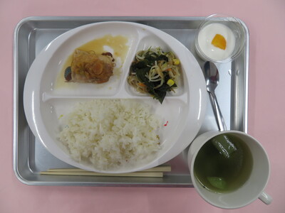 2025.11.26 11月26日(水) 揚げ鶏の甘酢ねぎソース 今日のメニューは、 ☆ご飯 ☆チンゲン菜の中華スープ ☆揚げ鶏の甘酢ねぎソース ☆中華風わかめサラダ ☆ピーチヨーグルト です。 ※写真は年中(うめ)組の量になります。