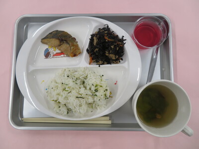 2025.11.27 11月27日(木) あじの梅味噌焼き 今日のメニューは、 ☆菜飯 ☆絹さやのすまし汁 ☆あじの梅味噌焼き ☆高野豆腐のひじきの煮物 ☆ぶどうゼリー です。 ※写真は年中(うめ)組の量になります。