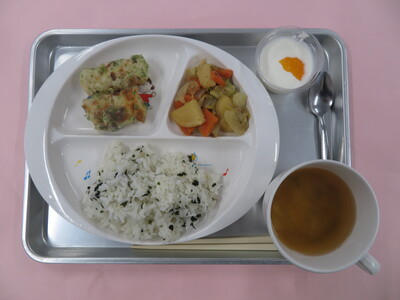 2025.11.06 11月6日(木) 竹輪の磯辺焼き 今日のメニューは、 ☆わかめご飯 ☆大根の味噌汁 ☆竹輪の磯辺焼き ☆野菜の和風煮 ☆みかんヨーグルト です。 ※写真は年中(うめ)組の量になります。
