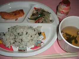 わかめご飯、鮭の照り焼き、昆布春雨サラダ、しいたけの清汁、ヤクルト