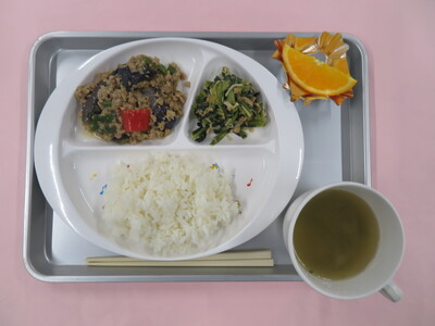 2025.12.15 12月15日(月) 麻婆なす 今日のメニューは、 ☆ご飯 ☆中華風コーンスープ ☆麻婆なす ☆小松菜とえのきの中華風和え物 ☆オレンジ です。 ※写真は年中(うめ)組の量になります。