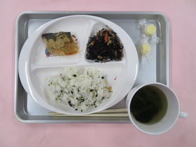 2025.12.16 12月16日(火) さばのねぎみそ焼き 今日のメニューは、 ☆わかめご飯 ☆ほうれん草のすまし汁 ☆さばのねぎみそ焼き ☆高野豆腐とひじきの煮物 ☆キャンディーチーズ です。 ※写真は年中(うめ)組の量になります。
