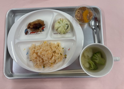 2025.12.17 12月17日(水) クリスマスメニュー 今日はクリスマス会です。 今日のメニューは、 ☆ケチャップライス ☆花野菜スープ ☆ローストチキン ☆ポテトサラダ ☆クリスマスゼリー です。 ※写真は年中(うめ)組の量になります。