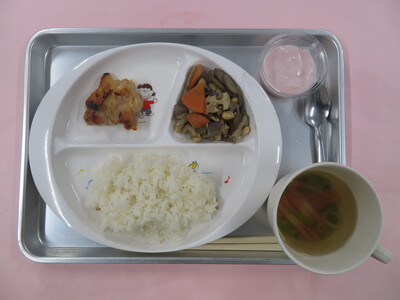 2025.12.04 12月4日(木) 鶏肉の西京焼き 今日のメニューは、 ☆ご飯 ☆かまぼこのすまし汁 ☆鶏肉の西京焼き ☆五目豆 ☆いちごのフルーチェ です。 ※写真は年中(うめ)組の量になります。