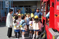 2017.02.17 2月17日防災訓練。 本日は、今年度最後の防災訓練を行いました」。 自由遊びの最中に行った事もあり近くにいた先生のそばに集まり指示を聞いて園庭に避難しました。 消防士さんや園長先生のお話を聞いた後は、先生たちの消化訓練を見たり消防自動車を見学しました。