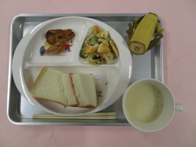 2026.02.05 2月5日(木) チキンソテーBBQソース 今日のメニューは、 ☆いちごジャムサンド ☆南瓜の豆乳ポタージュ ☆チキンソテーBBQソース ☆クラッカーサラダ ☆バナナ です。 ※写真は年中(うめ)組の量になります。