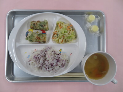 2026.03.12 3月12日(木) 竹輪の磯辺揚げ 今日のメニューは、 ☆ゆかりご飯 ☆豚汁 ☆竹輪の磯辺揚げ ☆そうめんサラダ ☆キャンディーチーズ です。 ※写真は年中(うめ)組の量になります。