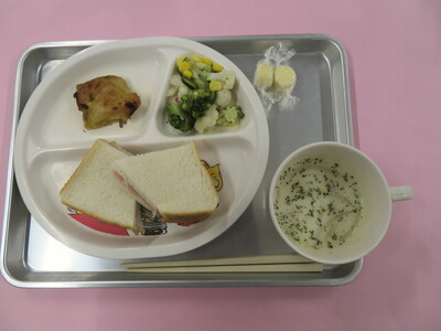 2025.03.06 3月6日(木) タンドリーチキン 今日のメニューは、 ☆いちごジャムサンド ☆コーンスープ ☆タンドリーチキン ☆花野菜のサラダ ☆キャンディーチーズ です。 ※写真は年中(うめ)組の量になります。
