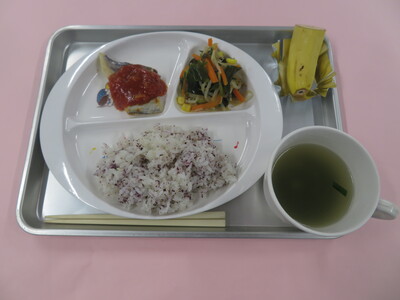 2025.09.18 9月18日(木) 白身魚のチリソース 今日のメニューは、 ☆ゆかりご飯 ☆ニラの中華スープ ☆白身魚のチリソース ☆中華風わかめサラダ ☆バナナ です。 ※写真は年中(うめ)組の量になります。
