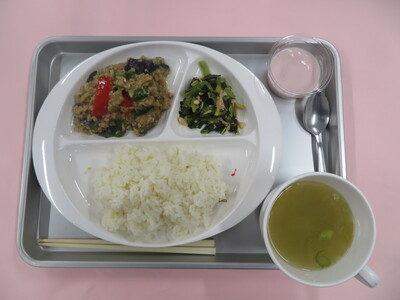 2025.09.24 9月24日(水) マーボー茄子 今日のメニューは、 ☆ご飯 ☆中華風コーンスープ ☆マーボー茄子 ☆小松菜とえのきの中華和え ☆いちごフルーチェ です。 ※写真は年中(うめ)組の量になります。