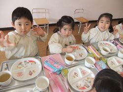 Home > 今日の給食 > お花畑ご飯 ぶりの照り焼き 千草サラダ ほうれん草のみそ汁 青りんごゼリー