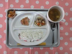 2026.02.03 ごはん けんちん汁 鶏肉の梅風味焼き 五目豆 きなこマカロニ たんぱく質・・・15.8g エネルギー・・・400Kcal ※3歳~5歳児の栄養価を記載しています。2歳児の栄養価は3歳~5歳児の75%の値です。