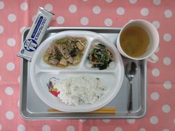 2026.02.24 ごはん しめじの味噌汁 豚肉のうま煮 ほうれん草の和風サラダ カルシウムウエハース たんぱく質・・・12.6g エネルギー・・・377Kcal ※3歳~5歳児の栄養価を記載しています。2歳児の栄養価は3歳~5歳児の75%の値です。