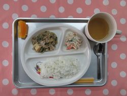 2026.01.19 ごはん じゃが芋の味噌汁 豚肉のねぎ塩炒め 切干大根のごまマヨネーズ和え オレンジ たんぱく質・・・14.2g エネルギー・・・420Kcal ※3歳~5歳児の栄養価を記載しています。2歳児の栄養価は3歳~5歳児の75%の値です。