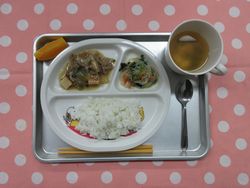 2025.11.25 ごはん なめこの味噌汁 豚肉のうま煮 和風春雨サラダ オレンジ たんぱく質・・・12.2g エネルギー・・・353Kcal ※3歳~5歳児の栄養価を記載しています。2歳児の栄養価は3歳~5歳児の75%の値です。
