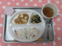 2026.04.21 ごはん もずくの中華スープ マーボー豆腐 ほうれん草のナムル いちごフルーチェ たんぱく質・・・12.6g エネルギー・・・360Kcal ※3歳~5歳児の栄養価を記載しています。2歳児の栄養価は3歳~5歳児の75%の値です。