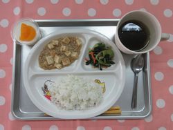 2025.10.08 ごはん もずくの中華スープ 麻婆豆腐 チンゲンサイの中華和え ミルク寒天 たんぱく質・・・11.4g エネルギー・・・331Kcal ※3歳~5歳児の栄養価を記載しています。2歳児の栄養価は3歳~5歳児の75%の値です。
