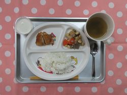 2026.01.15 ごはん もずくの味噌汁 鶏肉のマーマレード焼き 五目煮 ピーチヨーグルト たんぱく質・・・15.0g エネルギー・・・396Kcal ※3歳~5歳児の栄養価を記載しています。2歳児の栄養価は3歳~5歳児の75%の値です。