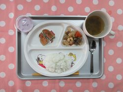 2025.11.14 ごはん もずくの味噌汁 鶏肉のマーマレード焼き 五目煮 ブルーベリーヨーグルト たんぱく質・・・15.0g エネルギー・・・390Kcal ※3歳~5歳児の栄養価を記載しています。2歳児の栄養価は3歳~5歳児の75%の値です。