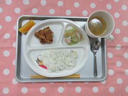 2025.10.07 ごはん わかめの味噌汁 鶏肉の竜田揚げ かまぼこサラダ オレンジ たんぱく質・・・13.6g エネルギー・・・390Kcal ※3歳~5歳児の栄養価を記載しています。2歳児の栄養価は3歳~5歳児の75%の値です。