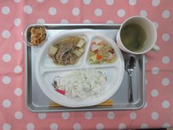 2026.03.02 ごはん オクラの味噌汁 すき焼き風煮物 かまぼこサラダ きな粉マカロニ たんぱく質・・・15.8g エネルギー・・・421Kcal ※3歳~5歳児の栄養価を記載しています。2歳児の栄養価は3歳~5歳児の75%の値です。