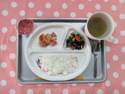 2026.01.21 ごはん オクラの味噌汁 トマトの照り焼きチキン ひじきの煮物 いちごゼリー たんぱく質・・・14.3g エネルギー・・・370Kcal ※3歳~5歳児の栄養価を記載しています。2歳児の栄養価は3歳~5歳児の75%の値です。