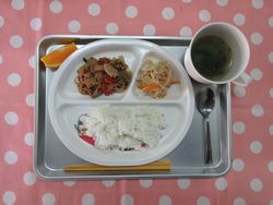 2026.02.02 ごはん チンゲンサイの中華スープ チャプチェ もやしのナムル オレンジ たんぱく質・・・11.8g エネルギー・・・381Kcal ※3歳~5歳児の栄養価を記載しています。2歳児の栄養価は3差~5歳児の75%の値です。