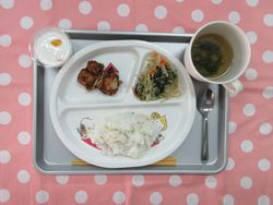 2025.10.28 ごはん ニラの中華スープ 鶏肉のごま揚げ もやしの中華風和えもの ピーチヨーグルト たんぱく質・・・13.0g エネルギー・・・388Kcal ※3歳~5歳児の栄養価を記載しています。2歳児の栄養価は3歳~5歳児の75%の値です。