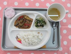 2025.09.24 ごはん 中華風コーンスープ マーボーなす 小松菜とえのきの中華和え いちごフルーチェ たんぱく質・・・13.7g エネルギー・・・384Kcal ※3歳~5歳児の栄養価を記載しています。2歳児の栄養価は3歳~5歳児の75%の値です。