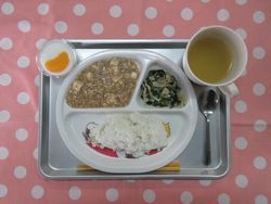 2026.02.12 ごはん 中華風コーンスープ 麻婆豆腐 小松菜とえのきの中華風和え物 ミルク寒天 たんぱく質・・・13.0g エネルギー・・・360Kcal ※3歳~5歳児の栄養価を記載しています。2歳児の栄養価は3歳~5歳児の75%の値です。