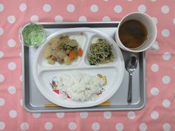 2025.10.10 ごはん 大根の味噌汁 肉じゃが ほうれん草の胡麻和え 青りんごゼリー たんぱく質・・・13.5g エネルギー・・・380Kcal ※3歳~5歳児の栄養価を記載しています。2歳児の栄養価は3歳~5歳児の75%の値です。
