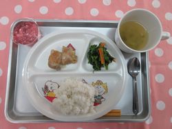 2026.04.14 ごはん 大根の味噌汁 鶏肉のマーマレード焼き ほうれん草のごま和え いちごゼリー たんぱく質・・・12.9g エネルギー・・・350Kcal ※3歳~5歳児の栄養価を記載しています。2歳児の栄養価は3歳~5歳児の75%の値です。