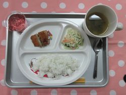 2025.11.11 ごはん 小松菜の味噌汁 鶏肉の照り焼き そうめんサラダ いちごゼリー たんぱく質・・・12.9g エネルギー・・・344Kcal ※3歳~5歳児の栄養価を記載しています。2歳児の栄養価は3歳~5歳児の75%の値です。