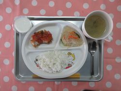 2025.12.17 ごはん 白菜の中華スープ 揚げ鶏のチリソース 中華風春雨サラダ ピーチヨーグルト たんぱく質・・・12.2g エネルギー・・・407Kcal ※3歳~5歳児の栄養価を記載しています。2歳児の栄養価は3歳~5歳児の75%の値です。