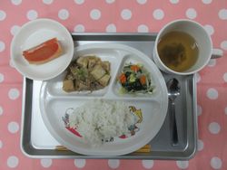 2024.04.24 ごはん 絹さやのすまし汁 豚肉の生姜焼き ポパイサラダ ルビーグレープフルーツ たんぱく質・・・12.2g エネルギー・・・312Kcal 2歳児 たんぱく質・・・9.1g エネルギー・・・234Kcal