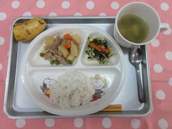 2026.04.17 ごはん 豆腐とわかめの味噌汁 肉じゃが ポパイサラダ バナナ たんぱく質・・・13.6g エネルギー・・・383Kcal ※3歳~5歳児の栄養価を記載しています。2歳児の栄養価は3歳~5歳児の75%の値です。