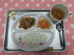 2025.06.03 ごはん 豆腐と椎茸の中華スープ チンジャオロース もやしのナムル キャンディチーズ たんぱく質・・・14.0g エネルギー・・・366Kcal ※3歳~5歳児の栄養価を記載しています。2歳児の栄養価は3歳~5歳児の75%の値です。