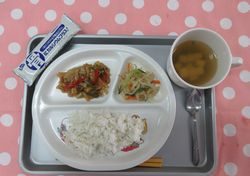 2025.11.04 ごはん 豆腐の中華スープ チンジャオロース もやしの中華風和え物 カルシウムウエハース たんぱく質・・・11.2g エネルギー・・・310Kcal ※3歳~5歳児の栄養価を記載しています。2歳児の栄養価は3歳~5歳児の75%の値です。