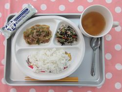 2026.01.13 ごはん 豆腐の中華スープ 回鍋肉 ツナとひじきの中華風和え物 カルシウムウエハース たんぱく質・・・13.1g エネルギー・・・369Kcal ※3歳~5歳児の栄養価を記載しています。2歳児の栄養価は3歳~5歳児の75%の値です。