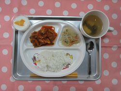 2026.02.25 ごはん 豆腐の中華スープ 酢鶏 中華風春雨サラダ ピーチヨーグルト たんぱく質・・・11.5g エネルギー・・・385Kcal ※3歳~5歳児の栄養価を記載しています。2歳児の栄養価は3歳~5歳児の75%の値です。