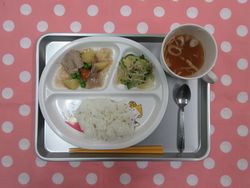 Home > 今日の給食 > ご飯 肉じゃが カニカマサラダ 油揚げのみそ汁