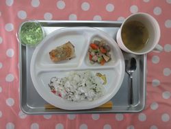 2025.12.16 なめし もずくのすまし汁 白身魚のみそマヨネーズ焼き 筑前煮 青りんごゼリー たんぱく質・・・13.3g エネルギー・・・332Kcal ※3歳~5歳児の栄養価を記載しています。2歳児の栄養価は3歳~5歳児の75%の値です。