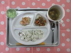 2026.02.10 なめし 豆腐ともずくのすまし汁 白身魚のみそマヨネース焼き 筑前煮 青りんごゼリー たんぱく質・・・13.3g エネルギー・・・332Kcal ※3歳~5歳児の栄養価を記載しています。2歳児の栄養価は3歳~5歳児の75%の値です。