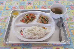 Home > 今日の給食 > なめし、白菜と豚肉の醤油煮、かにサラダ、ふの味噌汁、ブドウゼリー