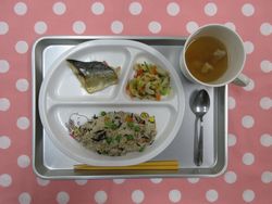 Home > 今日の給食 > ひじきご飯 鯖の塩麹焼き ちくわのサラダ 鶏汁