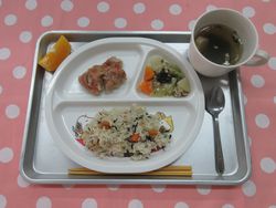 Home > 今日の給食 > ひじきご飯 鶏肉の梅肉風焼き 野菜の和風煮 花麩のすまし汁 オレンジ