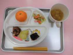 Home > 今日の給食 > もち(あんこ・きなこ・のり) 和風サラダ けんちん汁 みかん
