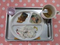2026.01.22 ゆかりごはん けんちん汁 さばの味噌煮 春雨サラダ ブルーベリーヨーグルト たんぱく質・・・14.4g エネルギー・・・370Kcal ※3歳~5歳児の栄養価を記載しています。2歳児の栄養価は3歳~5歳児の75%の値です。