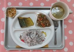 2025.11.19 ゆかりごはん ほうれん草の味噌汁 さばのカレー焼き レンコンの金平 きなこマカロニ たんぱく質・・・17.5g エネルギー・・・406Kcal ※3歳~5歳児の栄養価を記載しています。2歳児の栄養価は3歳~5歳児の75%の値です。