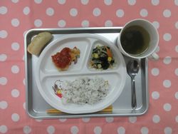 2025.09.19 ゆかりごはん ニラの中華スープ 白身魚のチリソース 中華風わかめサラダ バナナ たんぱく質・・・14.3g エネルギー・・・355Kcal ※3歳~5歳児の栄養価を記載しています。2歳児の栄養価は3歳~5歳児の75%の値です。